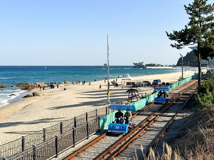 除了基础的观景设施、日系风格的站台,正东津站有趣的铁轨自行车值得玩一下!最少2人起,沿着既定轨道环一圈看海景。车子有动力加持,骑起来一点不累。