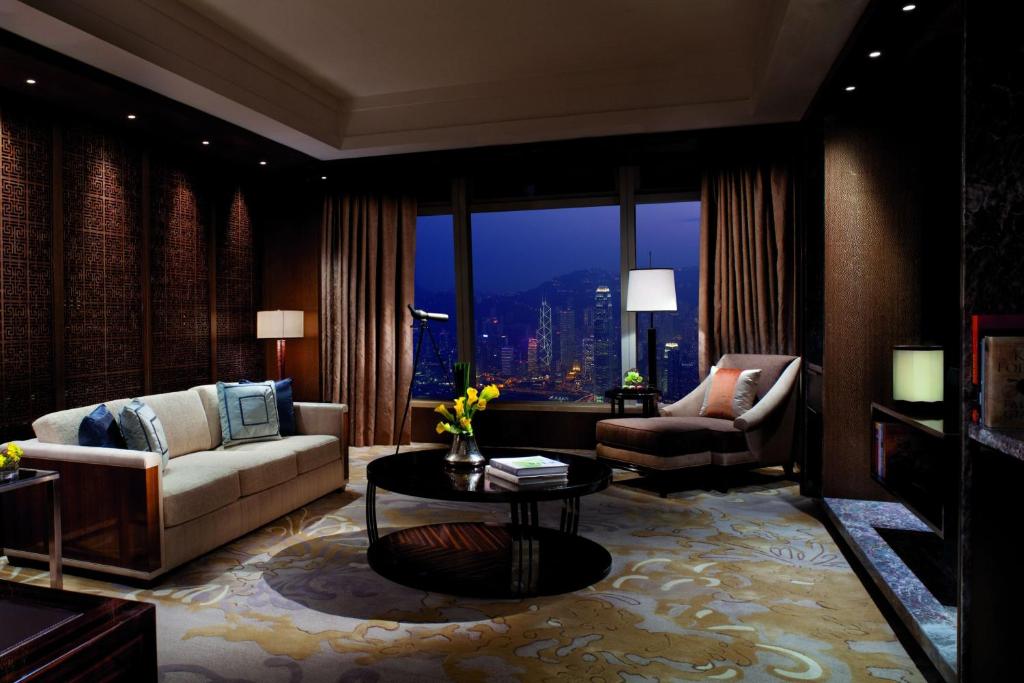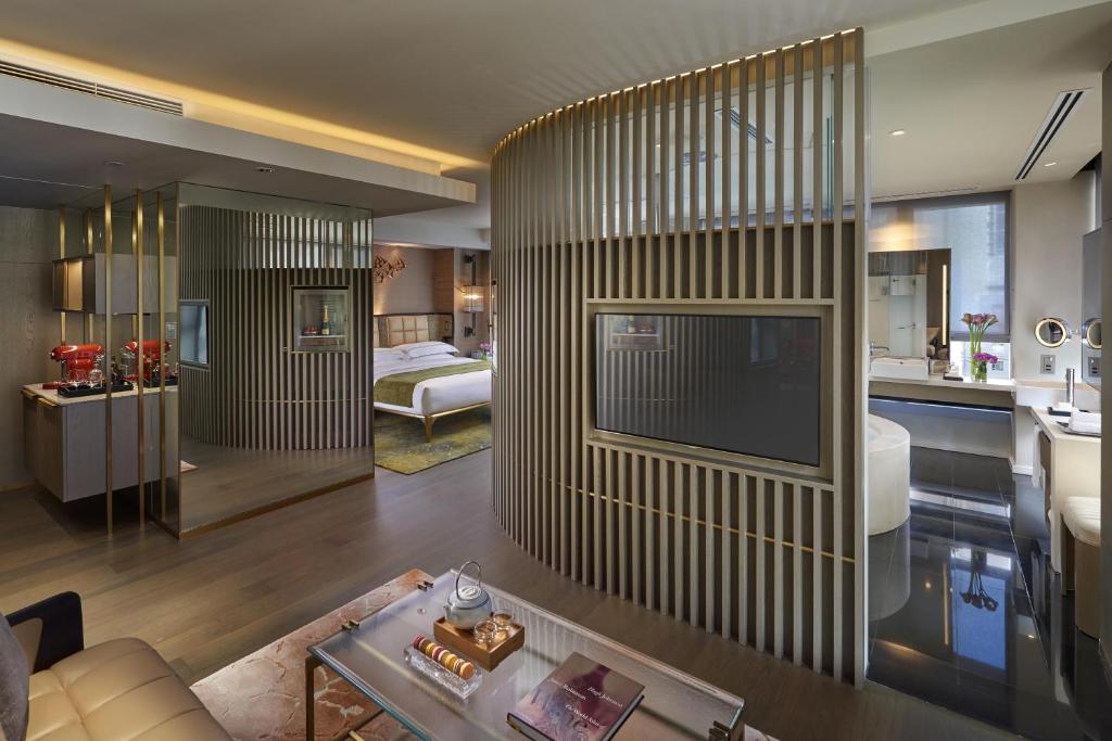 酒店室内由知名设计师傅厚民操刀,是全港首个以文化探索为焦点的尊贵住所。十楼公区随处可见的艺术摆件和大型雕塑,将人文情怀和艺术情操渲染得淋漓尽致。大篇幅的全通透的落地玻璃窗运用,将维多利亚港的美景引入室内,每个角落都美成一幅画。