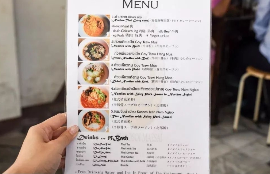 吃得津津有味的当地人咖哩鸡肉面的料理桌共有四个人忙进忙出,一下煮面、捞汤、放酌料…几乎没有闲暇的片刻。点餐则由另外一位鲜肉阿底负责。颜色超咖哩的咖哩鸡肉面,让刚下飞机后就来报到、饥肠辘辘的我们看得心花怒放,超期待!可能因为观光客真的太多,所以MENU上不仅有泰文,还有英文、中文、日文,连图片都放得好好,让用餐客人完全不用担心该怎么点餐。