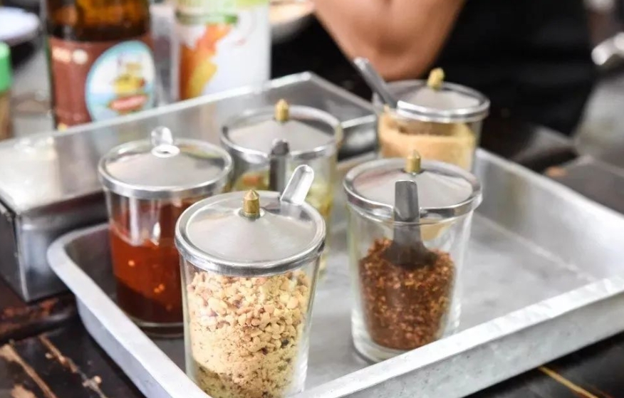 上桌后,可以发现桌上有许多调味料,香料、辣酱、花生、酸的、砂糖等可以自己加。可以从这边看得出来泰国人口味真的超重! 我自己是觉得原本的味道就已经很够,如果想再加味可以自己酌量使用
