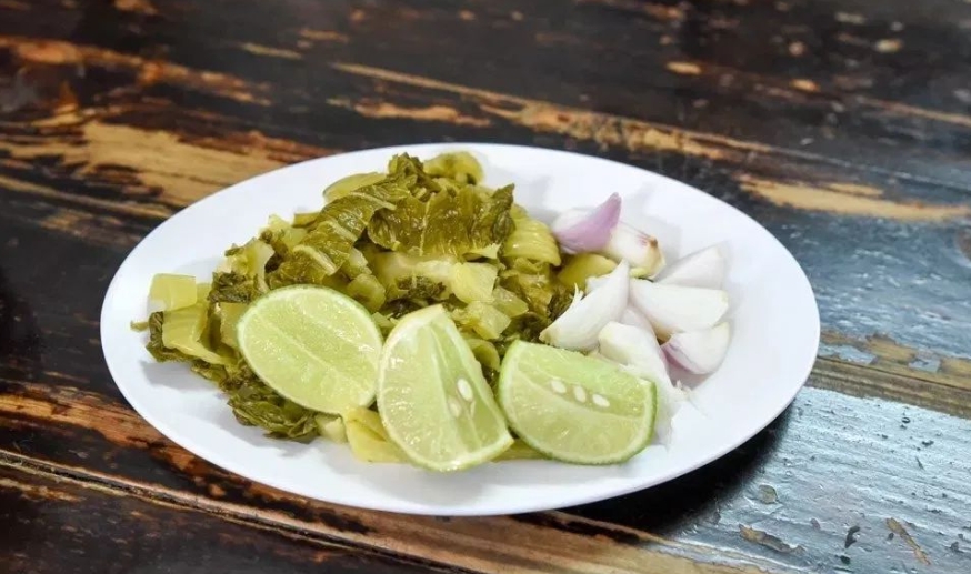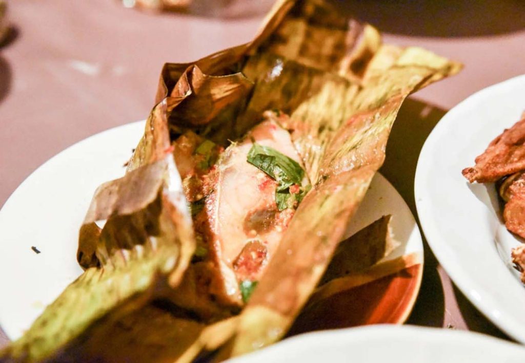 酸肉是一种半干燥的乳酸发酵猪肉料理,泰北菜中经常使用它当做食材。这道菜的做法是将酸肉和咸蛋用香蕉叶包裹好,腌制几天之后再放到火上炙烤。猪肉和鸡蛋的口感很嫩,食用的时候需要搭配花生米和生蒜,整体带着淡淡的蕉叶清香,口味竟然出奇地好。