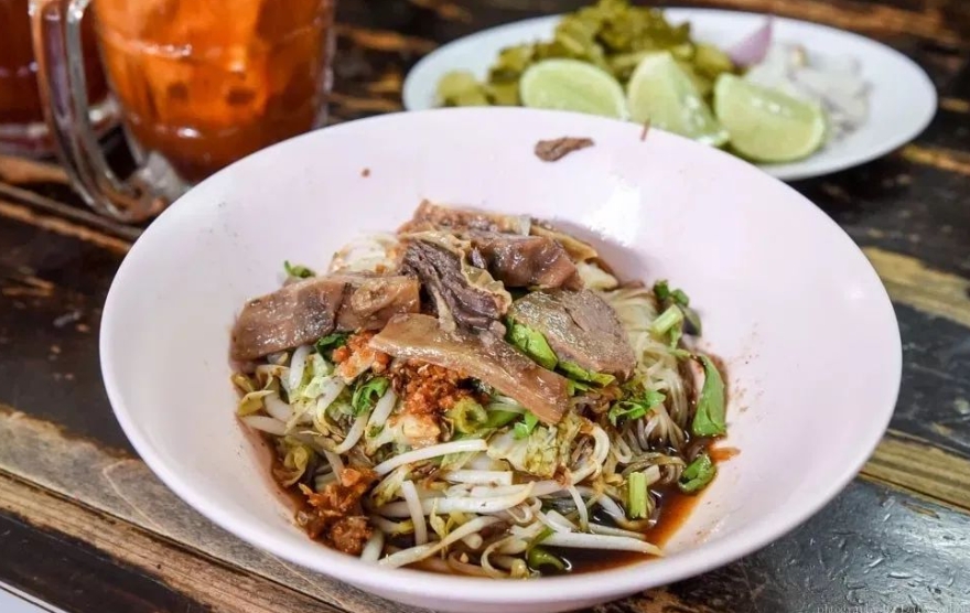 一碗牛肉干拌面居然只要50泰铢,客官你说说~来泰国是不是就是可以当大爷的一个国家啊~五、六块牛肉块,带一点皮跟一点筋,口感软嫩,牛肉味也很重,不得不说真的是很美味的牛肉!底下的面条则是微微透明的细面条,搭配香菜、豆芽、芹菜及特殊酱汁一起吃,咸香味刚刚好。