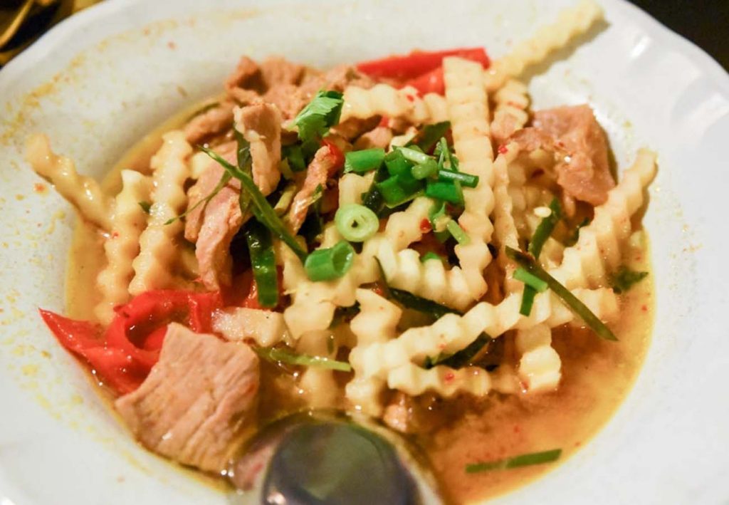 看起来很辣的猪血米粉汤,吃起来有点辣,但我觉得最辣的还是咖哩鸡肉面。猪血看起来很好吃,也是一道相当重口味的泰北小吃。米粉不是我们中国那种细米粉、粗米粉,反而比较像薄版的板条。