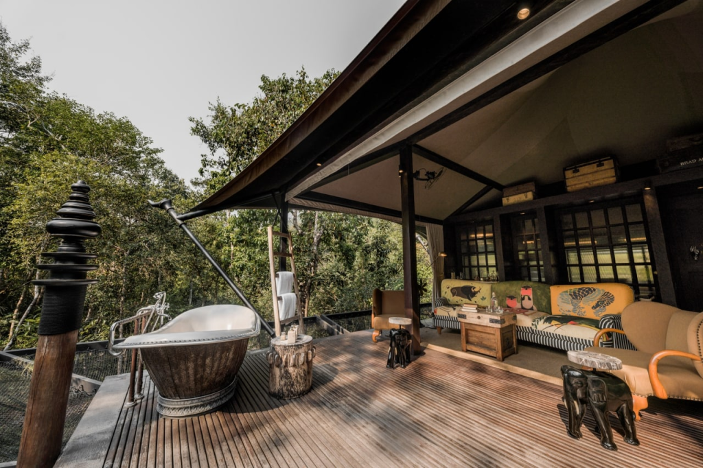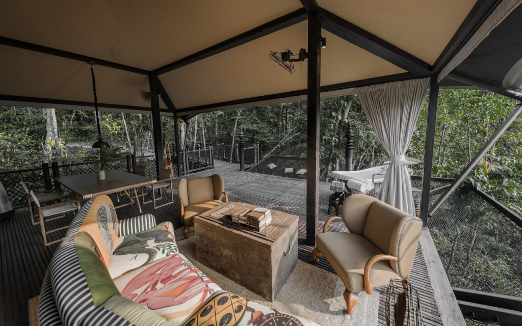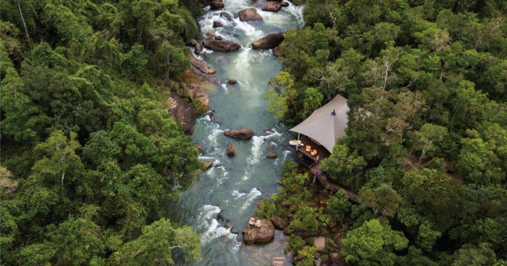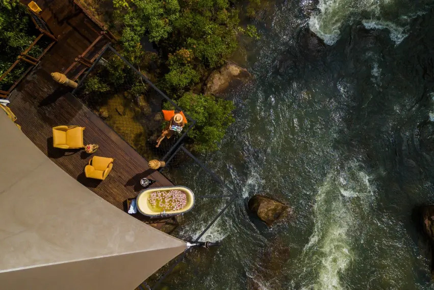 仅有的15顶帐篷别墅每顶帐篷沿河而建隐匿于雨林之中古董家具、私人泳池、户外浴缸与野性自然完美交融宛如永恒而奇思妙想的浪漫绿洲。