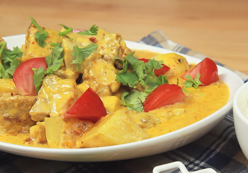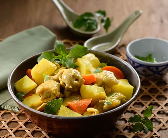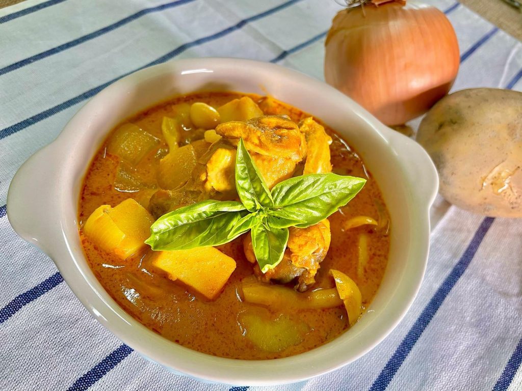 柬式黄咖喱香而不辣,比泰式温和,椰香浓郁。鸡肉炖得入味又不柴,一口下去满嘴软香。做法是鸡肉与咖喱糊炒香,再加入椰浆和土豆炖煮,汤汁浓稠下饭特别棒。