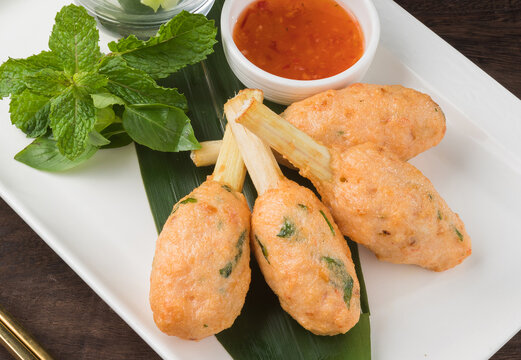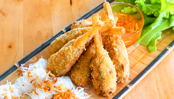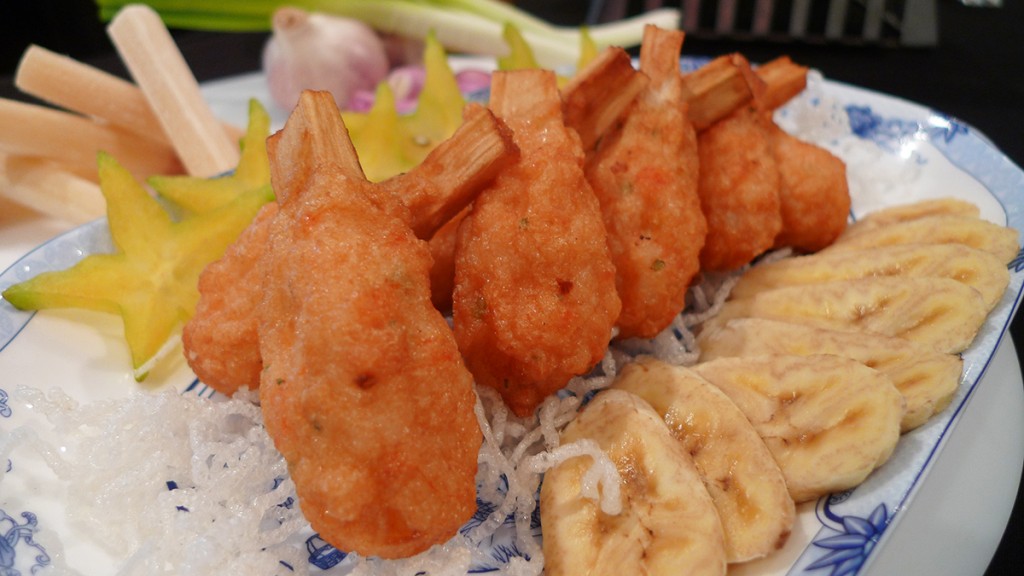 这道菜是把虾泥包裹在甘蔗棒外,外脆里嫩,甘蔗还带点清甜。吃的时候一口咬下,虾肉鲜香、甘蔗多汁。做法是虾剁成泥,加上调料搅拌,裹在甘蔗上油炸成金黄。