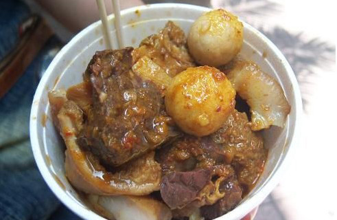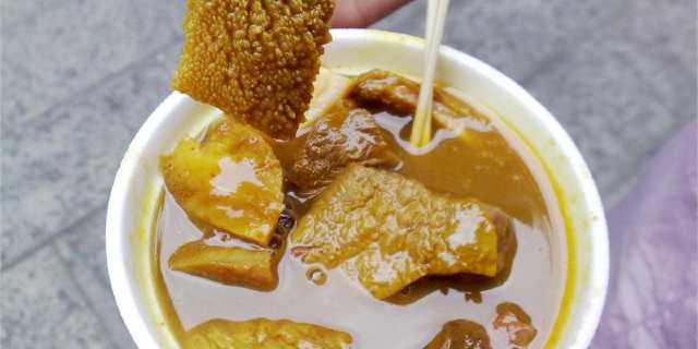 在澳门街头,牛杂车是移动的江湖。牛肚、牛肠、牛肺在十几种香料熬煮的咖喱汤中翻滚,老档主用剪刀将内脏剪成适口小块,淋上浓稠咖喱汁,再撒一把青葱与香菜。三巴灯塔旁的「明记牛杂」已传承三代,汤底用柱侯酱、南乳与八角熬制八小时,内脏处理得干净无腥,软糯中带着嚼劲。澳门人吃牛杂必配酸萝卜与辣椒酱,酸辣开胃,仿佛在味觉中上演一场市井武侠剧。