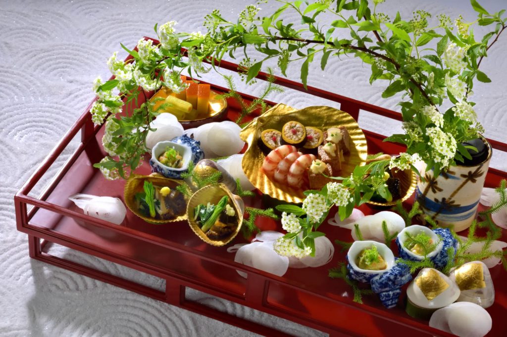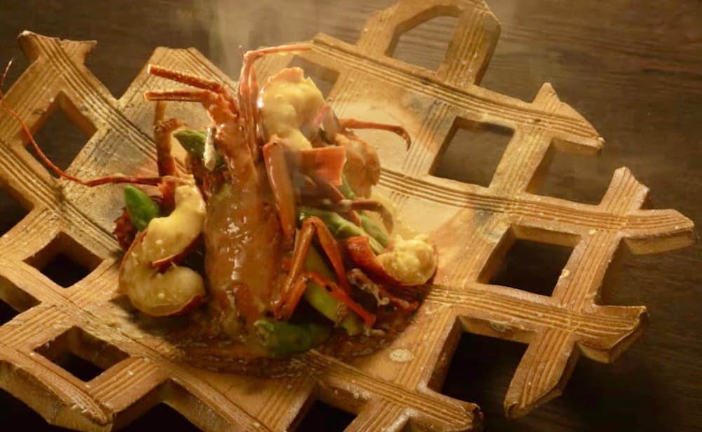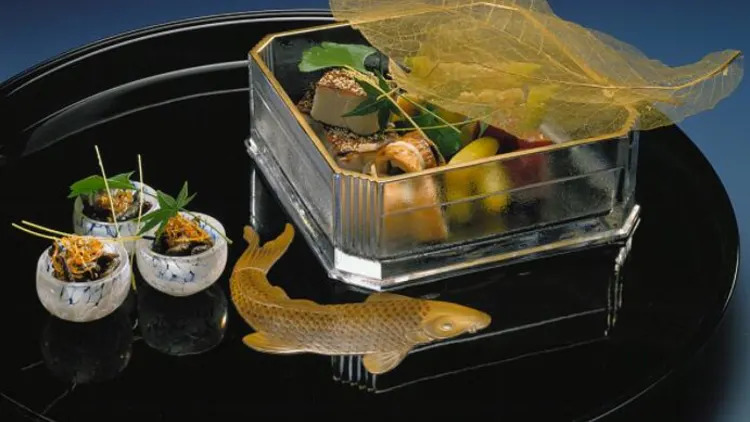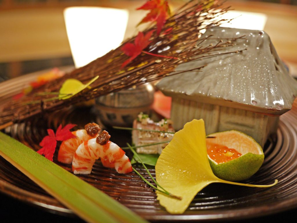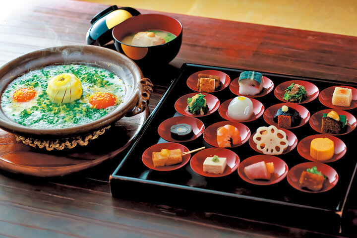 旅馆一日只接 45 位午席+25 位宿客晚席。每年的柚子套餐是最热门的,将二斤重巨大柚掏空成碗,装入糯米、鲣高汤、昆布熬制 40 分钟,米粒吸满柚皮精油后香得像暖香薰。主菜晚冬多用寒鲷+甜白味噌,也是京都味噌代表。
