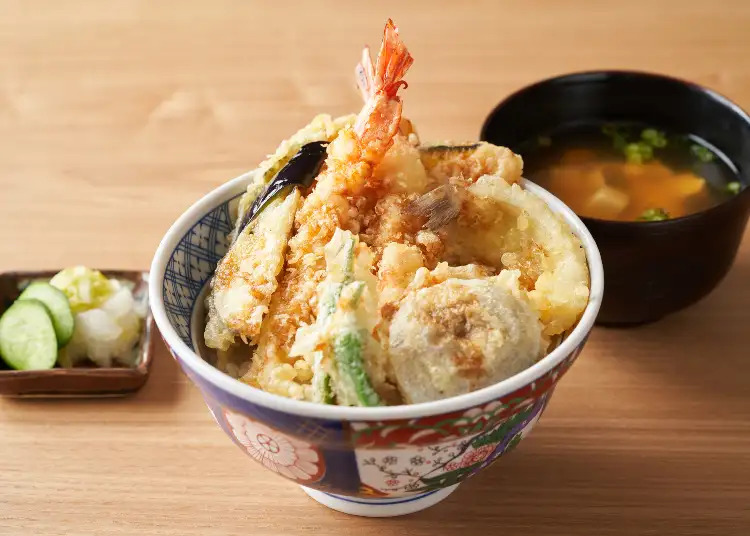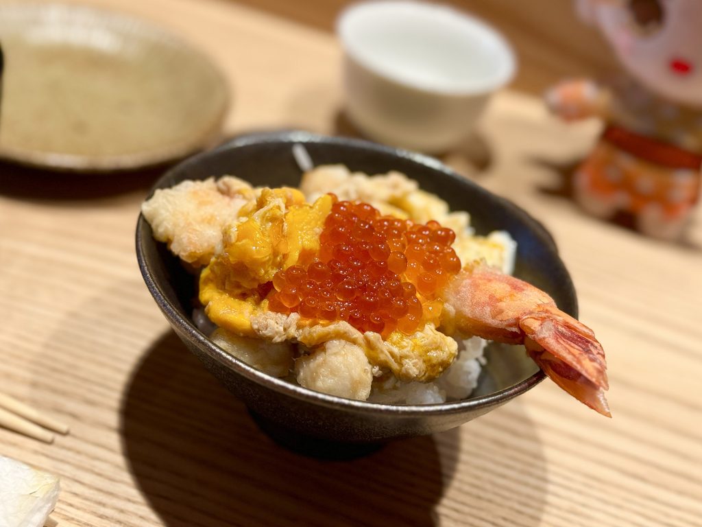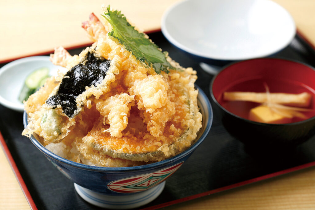 人气第一的「海老天とじ丼」把两只超大黑虎虾裹超薄衣,起锅立刻覆以半熟鸡蛋与秘制酱油,蛋液浸衣却仍脆。从单品到天妇罗盖饭,能吃到炸海鲜、和牛、鸡肉、蔬菜。