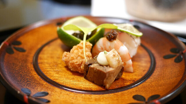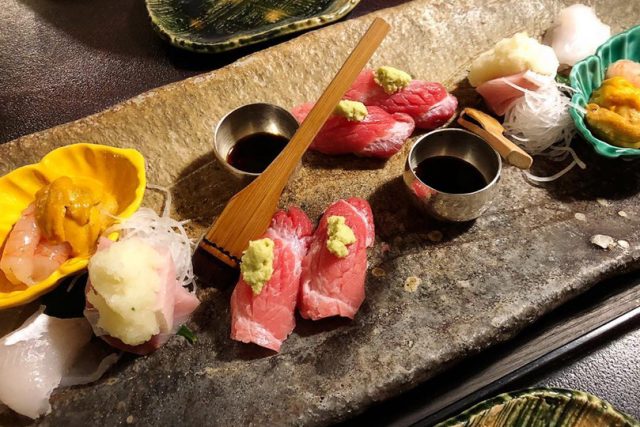 套餐为18种时令海鲜&蔬菜,均有店主采购于锦市场&大原朝市,掌勺佐藤大将曾在吉兆修行 10 年,为人和善,特别健谈,提供英文服务。