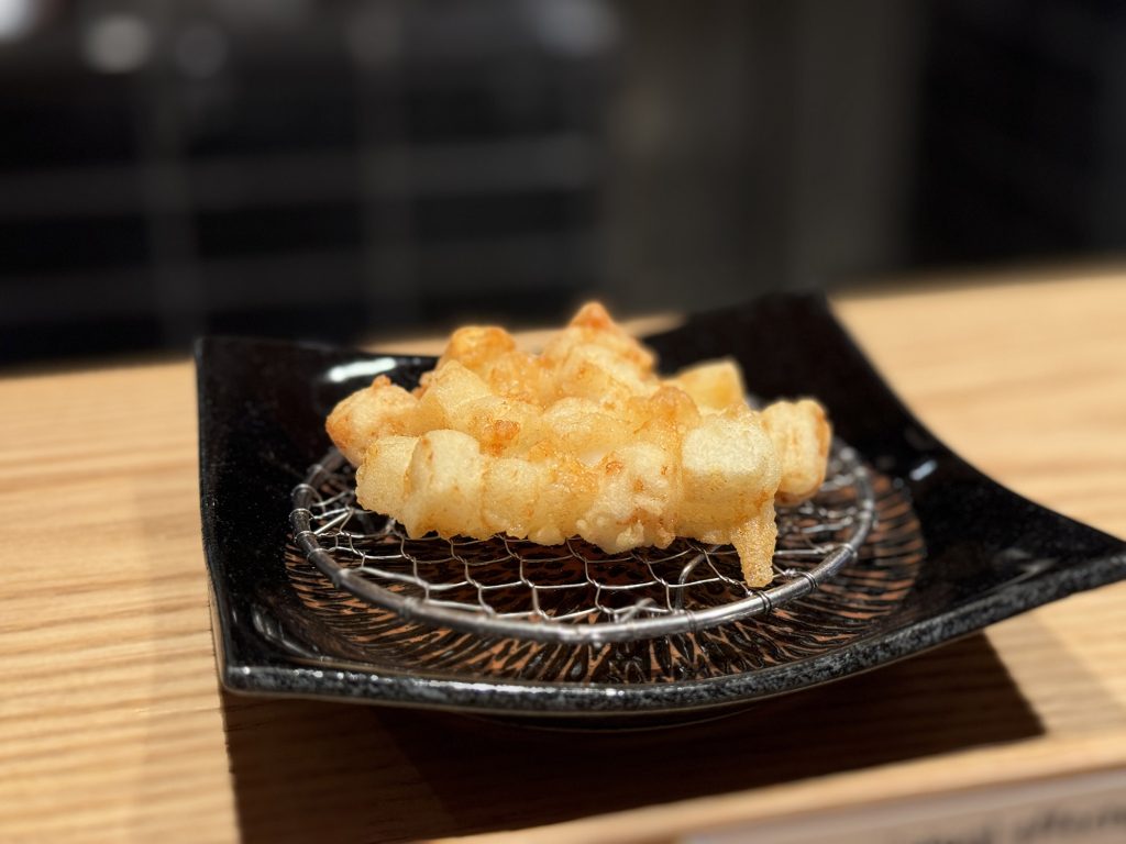 京星的天妇罗衣薄到能透光:面粉+冰水+少许纯米醋,不加蛋液,因此色泽近象牙白。虾仁一咬水汽外逃,外壳却似“脆空气”。