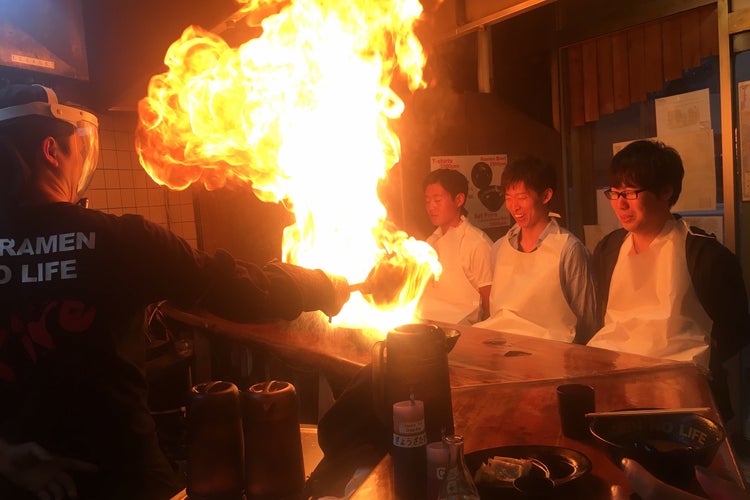 说到京都奇葩美食,绝不能错过这家开店前就排长龙的马鹿一代喷火拉面Menbaka Fire Ramen。