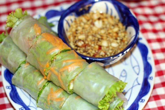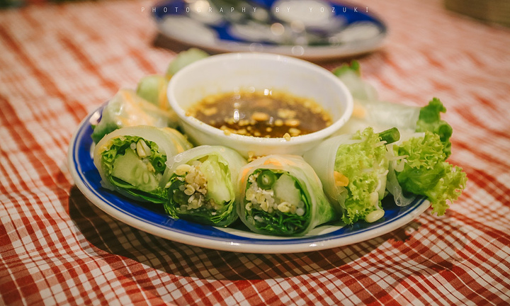 柬式春卷类似我们的卷煎饼,新鲜的蔬菜卷在薄薄的煎饼里蘸着调料吃,还有一种春卷DeepFriedSpringRoll,才是我们的炸春卷,各家的馅料、蘸料都不一样,味道也很好。