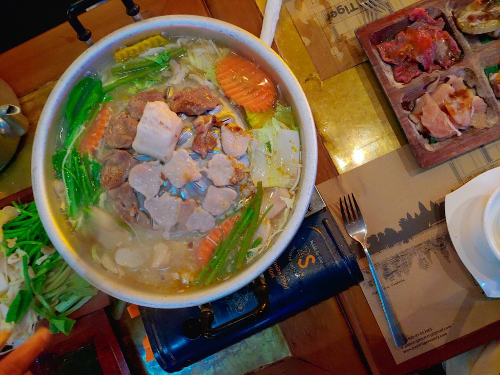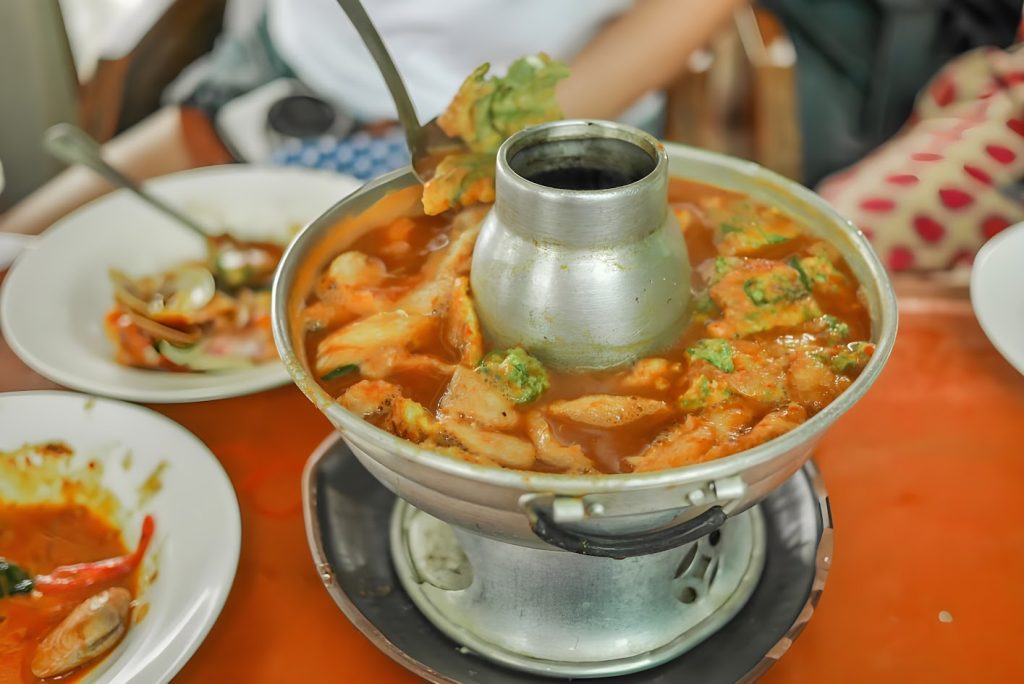 柬式火锅一次性满足吃货两个愿望:火锅+烧烤。烧炭锅同时做火锅和烧烤用,吃火锅时锅中放一个凸起的空盘子,上面烤肉,上面煮肉,烤肉的时候,肉汁和底下的黄油流入四周的汤中,增加了鲜味与黄油的丝丝奶甜。