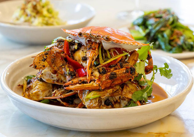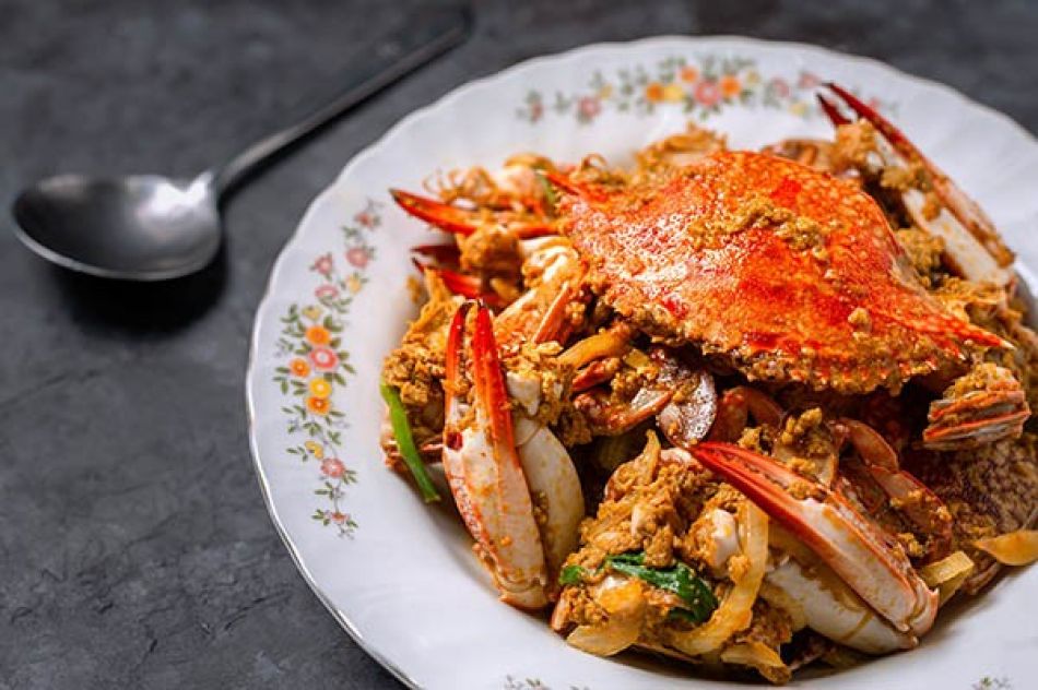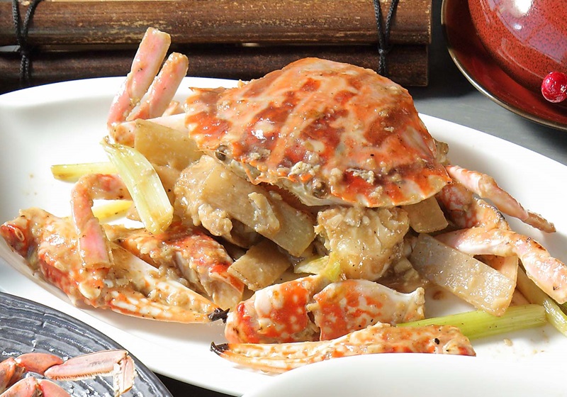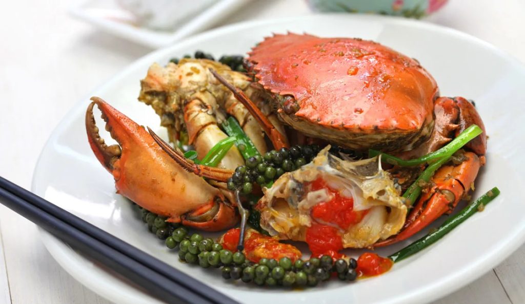 油炸螃蟹是柬埔寨的海滨城市白马市的特色菜。这道菜由新鲜的螃蟹和本土的贡布青椒炒制而成。