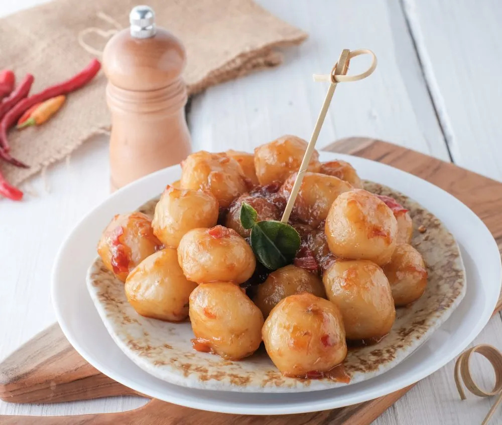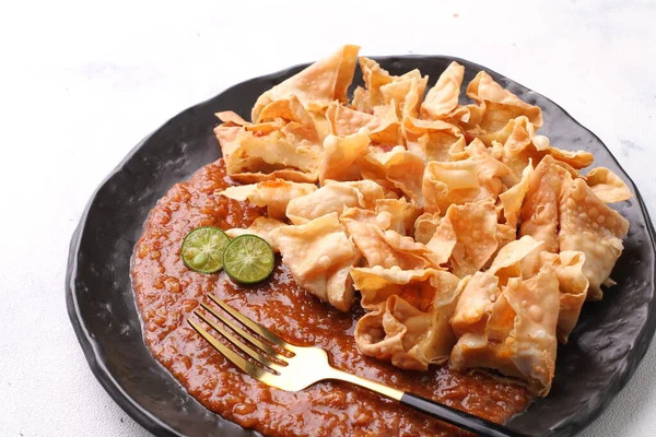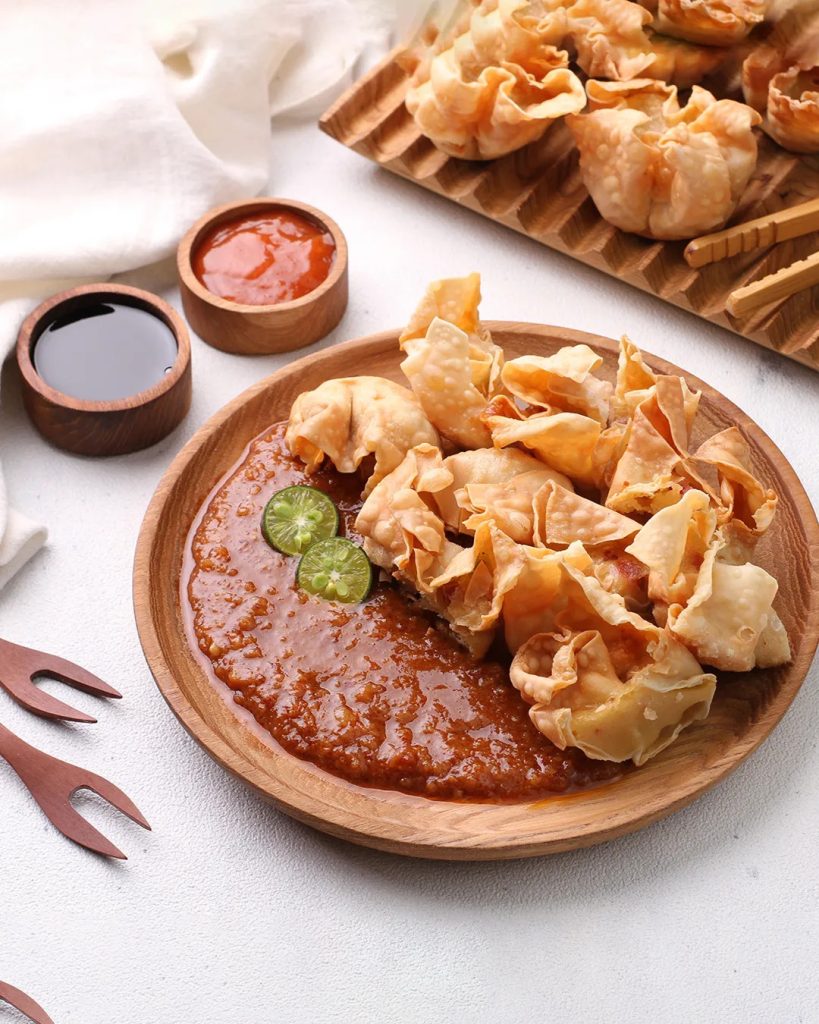 印度尼西亚最著名的小吃之一是巴打果(Batagor),这是一种用传统辣酱制成的炸饺子。它植根于中国饺子,将其改进为油炸的。内馅也通常是鱼肉丸、豆腐丸或肉丸。“Batagor”这个词是”Bakso Tahu Goreng” (炸豆腐肉丸)的缩写。