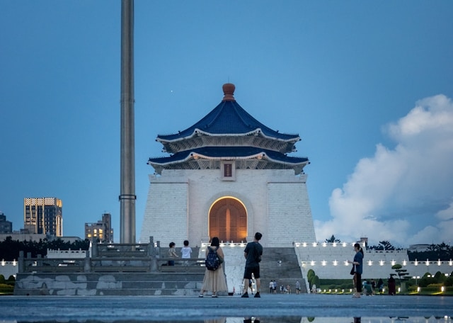 中正纪念堂,这里是为了纪念中华民国第一任总统蒋中正为建立,建筑外观以白色墙面为主,屋瓦则饰以宝蓝色琉璃瓦,园区包含牌楼、博物馆、广场和花园,宏大壮硕,让来访的旅客留下深刻的印象。欣赏卫兵交接仪式,整齐划一的动作,庄严肃穆的氛围,令人不由得肃然起敬。