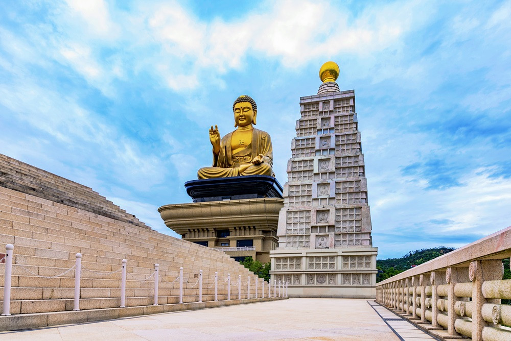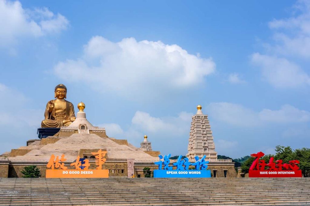 佛光山这座庄严肃穆的寺院最令人印象深刻的非「大佛城」莫属,端庄雄伟的大佛金像高达120公尺,面向日出东方,俯瞰高屏溪水,是东南亚最高的立佛。周围环绕着480尊较小的接引佛像,给人千佛护持的肃穆感,参观过的旅人都会为这庄严恢宏的气度留下深刻印象。