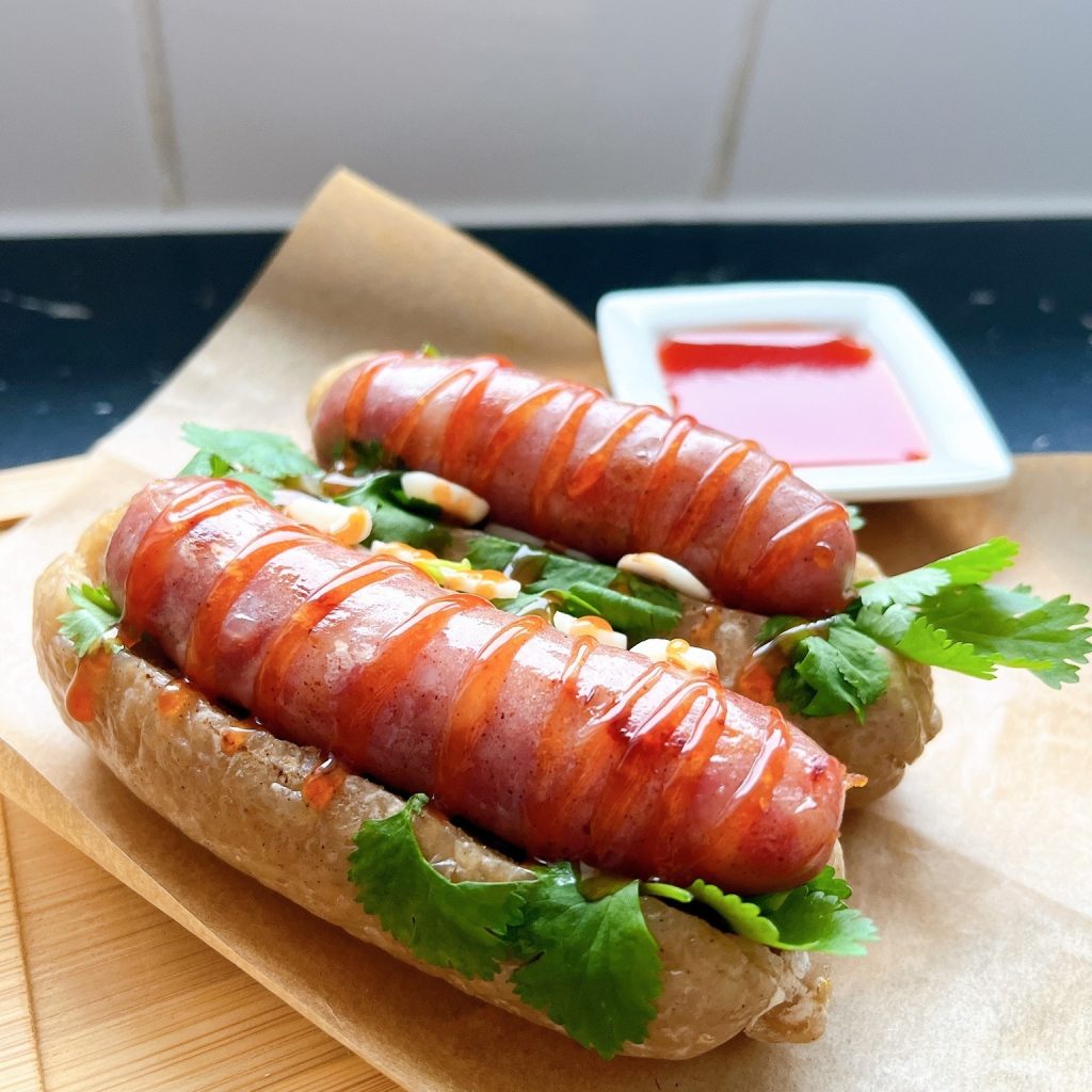 大肠是糯叽叽的糯米肠,小肠是台湾烤肠,搭配蒜片和酸甜的黄瓜片,小肠放在大肠上方烤制而成。