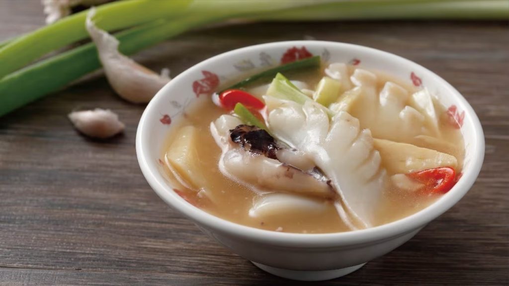 整个菜以汤羹的形式为主,花枝就是墨鱼、鱿鱼,鱼片被切成花刀,烹饪受热后卷曲起来,就像一朵朵小花。