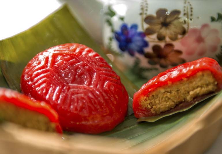 通常红龟粿的内馅是甜甜的绿豆沙,不过也有红豆沙馅和花生馅等其他馅料的选择,一般会放在植物绿叶上售卖。