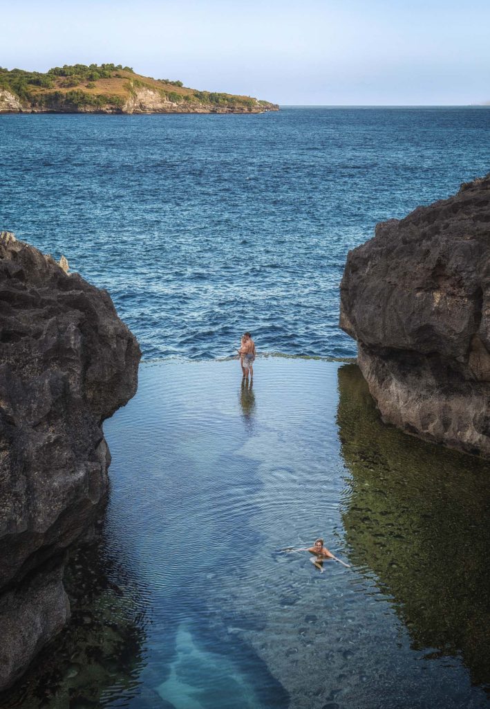 天神浴池:悬崖的中部就是天神浴池,Angel’s Billabong。浴池其实是一个天然的小港湾带状池子,碧绿碧绿的,池水不深,池边比海平面要高不少,平时海浪灌不进来,很平静,一个天然的海边无边泳池。网上看见有人在池子里游泳拍照,但这次没有看见游客下水,可能是已经不允许下去了吧。有台阶可以下到池子离水面不远的地方,继续踩着火山石就能到水面。池子上方的台阶上有几个人在拍照,没有人下池子游泳、拍照。池子里看似都是碧绿的海苔,估计是挺滑的。我们站在悬崖上方,拍了风景照,结束游览。