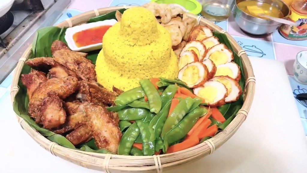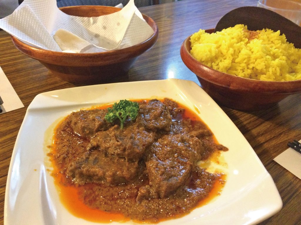 黄澄澄的手抓饭,伴碟有正宗的印尼虾片、巴东牛肉、炸玉米饼、牛肉格卜等香口食物。手抓饭,按照印尼人的习惯要用右手吃。手抓饭黄澄澄的,堆成一个圆锥状。周围摆着印尼饼、牛肉格卜、炸鸡块、虾片等。这个套餐,你可以同时尝到几款不同的印尼菜。手抓饭吃起来很有粘性,还有点辣辣的姜味。原来它叫黄姜饭,是用黄姜汁和香料粉混合泰国香米煮成的。