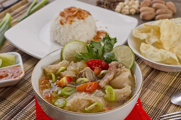 印尼式牛尾汤超大份的牛尾高压炖至软烂轻轻一挑,骨肉分离,搭配柑橘 熏香过的米饭,搭配印尼特色小吃脆片,泡进汤里,嘎吱嘎吱,一半酥脆一半软嫩喜欢吃辣,再加入灵魂特制参巴辣酱最后挤一点鲜酸柑汁各种风味,一口入魂,也可以用“宝总泡饭”的方式直接把肉汤泡进米饭里尽情地大快朵颐。 印尼牛尾汤,是个精彩绝伦的美食组合包:既能吃、又能喝……鲜美的汤汁,炖到脱骨的牛尾肉、胡萝卜、土豆、番茄和混合香叶香料!再配上米饭、脆片、辣椒和青柠汁畅快享用!清淡却不寡淡,味道浓郁鲜美。牛尾炖得软烂没有牛膻味,加上丁香等特别的香气,热乎乎地来上一碗,暖胃又暖心!