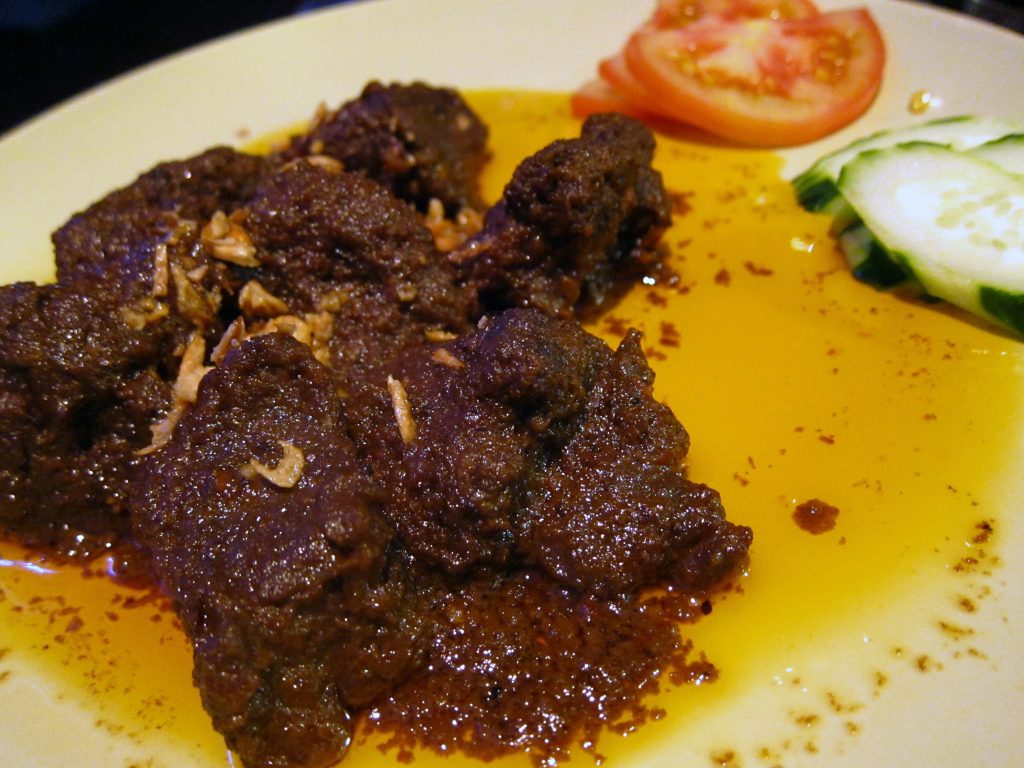 巴东牛肉的香艳在于火红的卖相,让人忍不住垂涎。这道巴东牛肉仅调料就用了近10种:印尼青桔子(这是一种有柠檬清香的青桔子)、香叶、香茅、桔子叶、南姜、洋葱、辣椒、咖喱等。先将洋葱和咖喱爆香后,将牛肉和各种香料放入爆炒,再倒入椰酱将牛肉煮至软熟。上盘的巴东牛肉因为辣椒酱的缘故热情如火,入口仍然保持一样的热情火辣,而牛肉很嫩,多种香料糅合在牛肉之中形成独有的香味。如果要求按照印尼当地的辛辣程度做,那种火辣更爽。