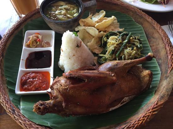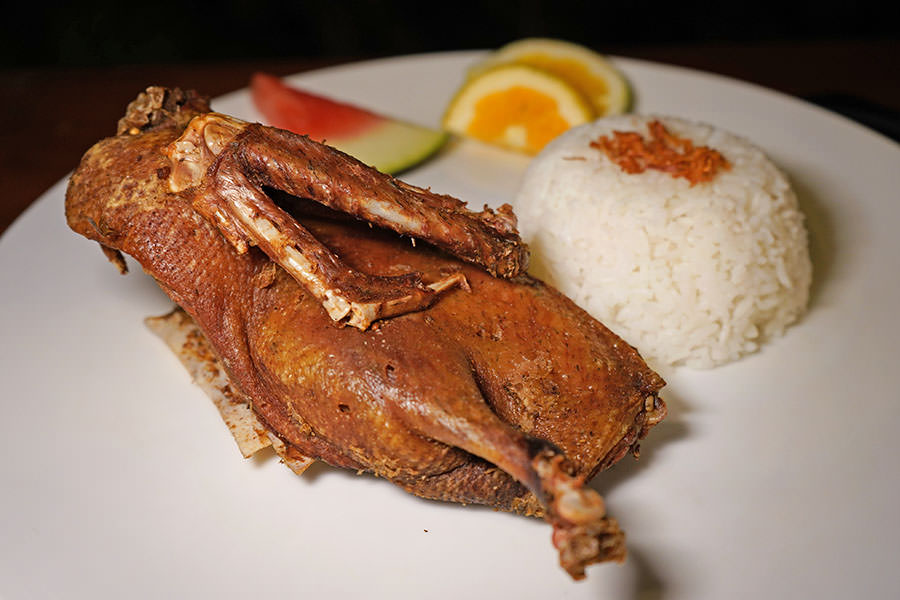 脏鸭餐是一份由好几种小菜和蘸料搭配的套餐。半只鸭子烤成棕色,放在翠绿的芭蕉叶上;用手一撕,鸭肉酥酥脆脆的,放进嘴里没有太油腻的感觉。同时,由于烤制之前,会用由多种本地香料特制的“秘汁”腌制,因此也去除了鸭子的异味。