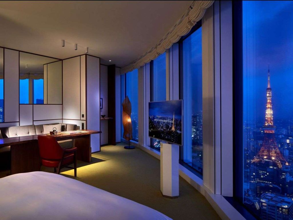 酒店仅设164间客房,基础房型面积从50平方米起跳,在东京实属罕见。客房内大量运用和纸、北海道胡桃木等天然材料,营造出低调奢华的氛围。最令人难忘的是51楼的The Tavern餐厅与52楼的屋顶酒吧——这里拥有东京少见的露天酒吧,夜幕降临时,东京铁塔的灯光与城市天际线在此交汇,美不胜收。
