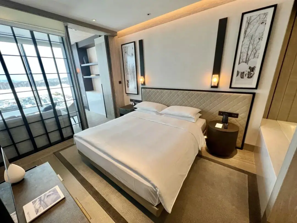 酒店拥有100间客房,包括28间套房和9间带半露天温泉的套房。所有房型均配备落地窗,躺在床上便可欣赏窗外的雪场与远山。设计灵感源自日本纸质屏风,卧室与起居空间通过玻璃和木材组合的隔墙巧妙区隔。