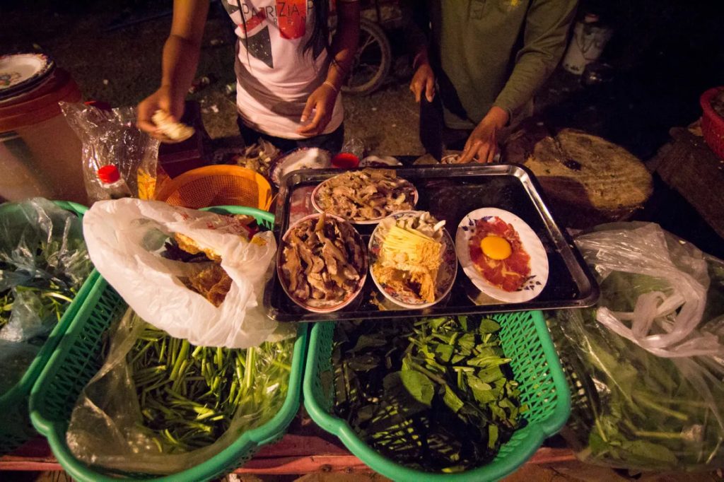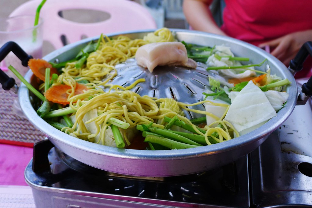 柬式火锅是一种传统的柬埔寨火锅。它通常包括新鲜的肉类和蔬菜,搭配特制的蘸酱食用。