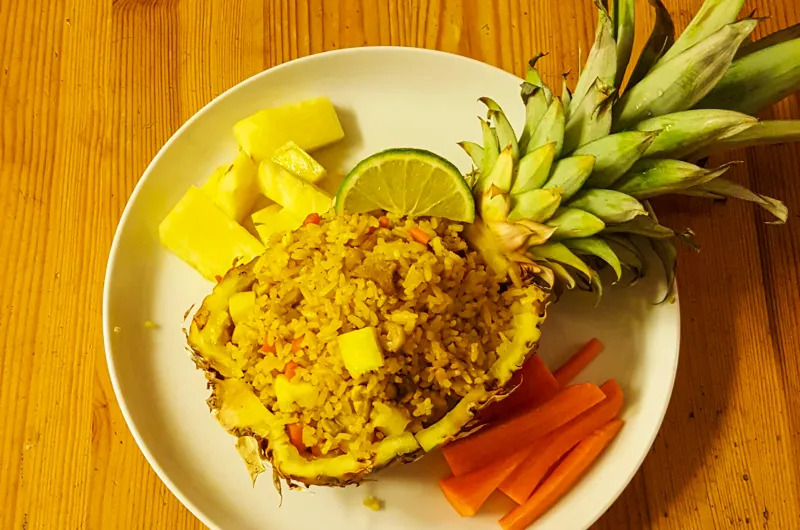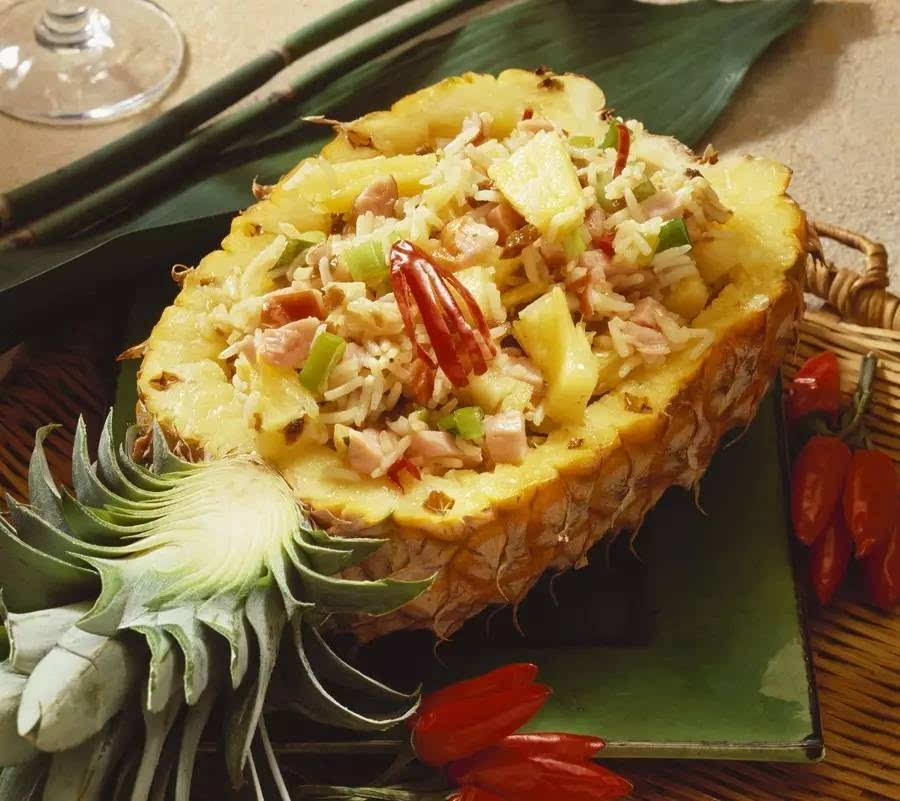 菠萝饭是一道有着淡淡菠萝香味的米饭菜品,通常会加入一些菠萝块、葡萄干和坚果。