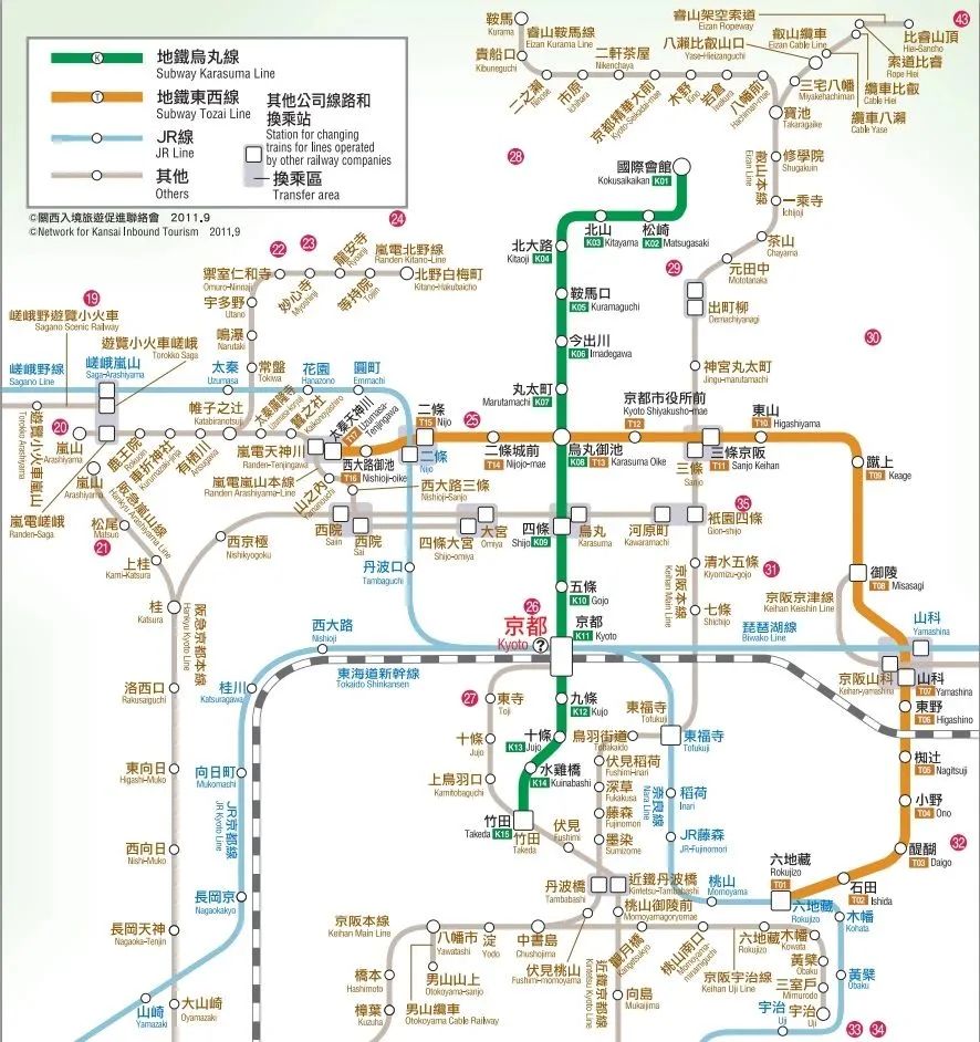 京都古迹真的太多,很难在他们下面挖地铁,所以京都地下铁只有两条路线:乌丸线和东西线。