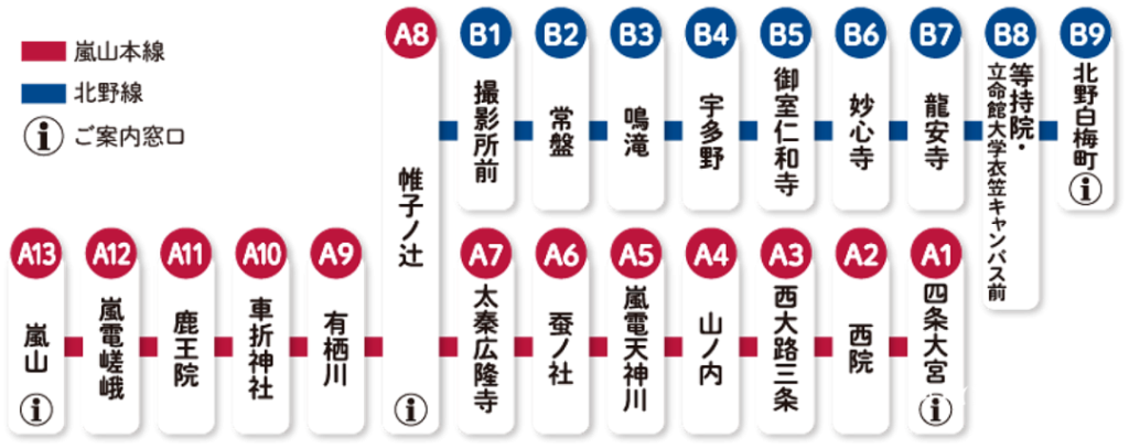 岚山电车路线只有两条路线「岚山本线」与「北野线」,京都到岚山交通会使用到「岚山本线」,京都市区到金阁寺、北野天满宫会使用到「北野线」。