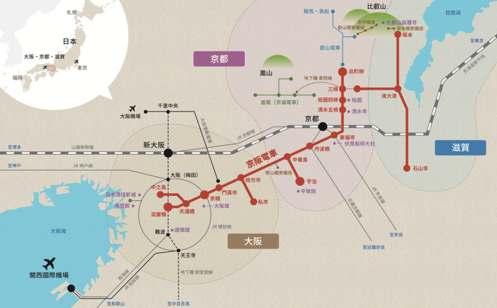 顾名思义即是往返大阪与京都的电车,沿路景点可到「大阪城」、「平等院」、「伏见稻荷」、「清水寺」和「祇园」,也可开往位于京都南方的「宇治」。