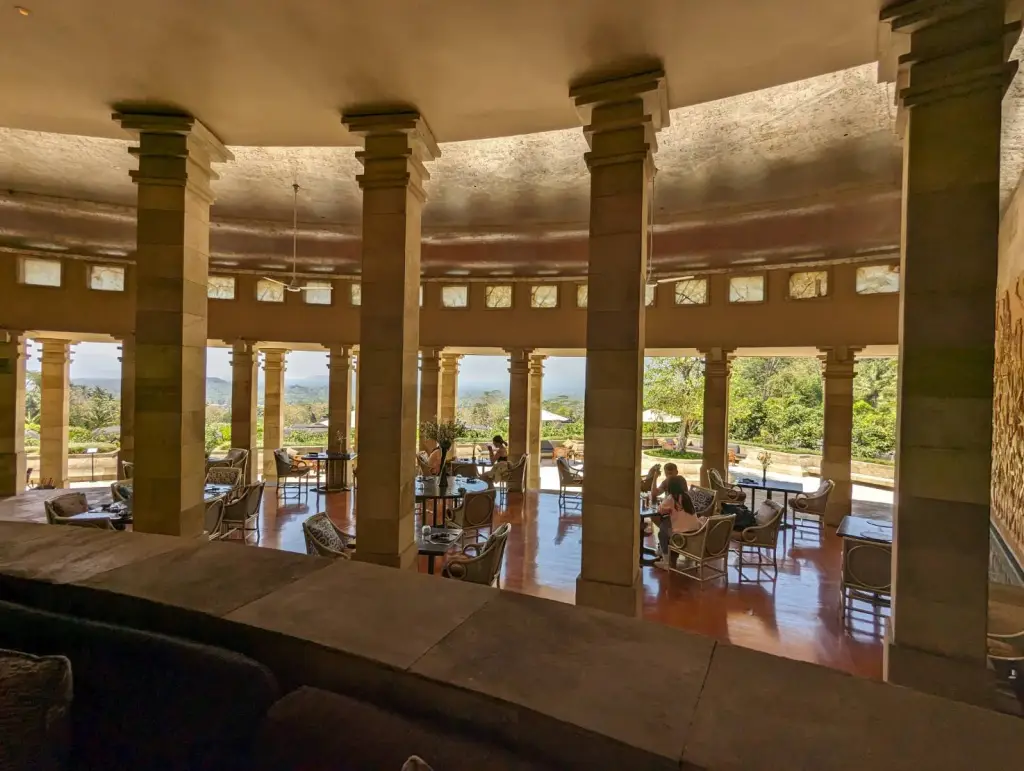 如果说房间像是宫殿,那么餐厅就像神堂了。Amanjiwo的餐厅石柱环绕,将稻田景色、婆罗浮屠及巍峨的火山景致尽收眼底。餐厅还拥有自己的印尼传统乐团,每到晚餐即为来宾们奉上精彩传统表演。