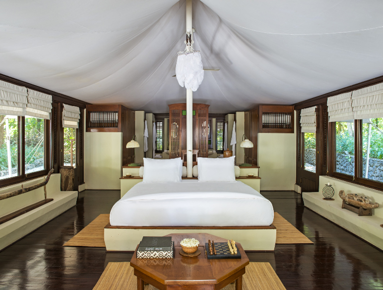 酒店客房主要分为Jungle Tent丛林帐房和Ocean Tent海洋帐房。丛林帐房四周有坚固围墙,配有一个珊瑚石质露台,每一间都设有柔性防水屋顶及独立的市内帆布质空间。