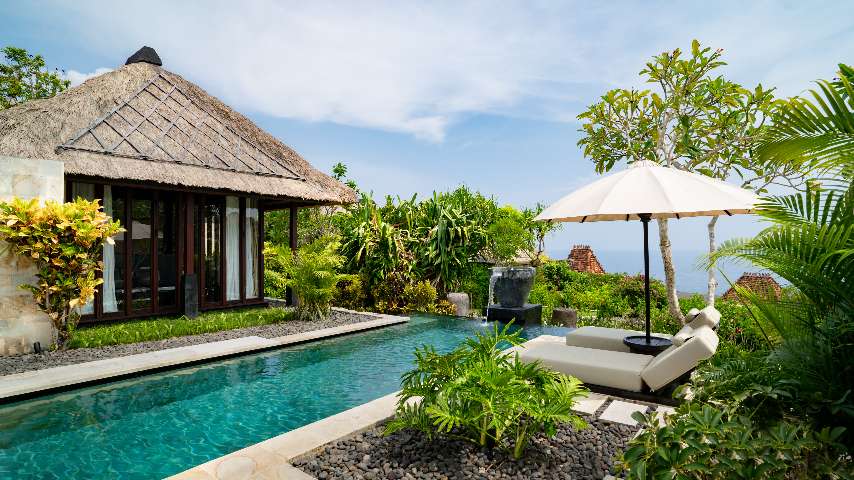 巴厘岛空中花园酒店共有30间豪华泳池别墅,6间全景豪华泳池别墅,2间家庭泳池别墅。这些别墅都以传统巴厘式风格装修,有独立的泳池,茅草顶,非常有山野之趣。