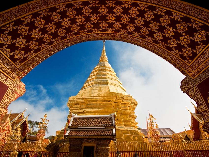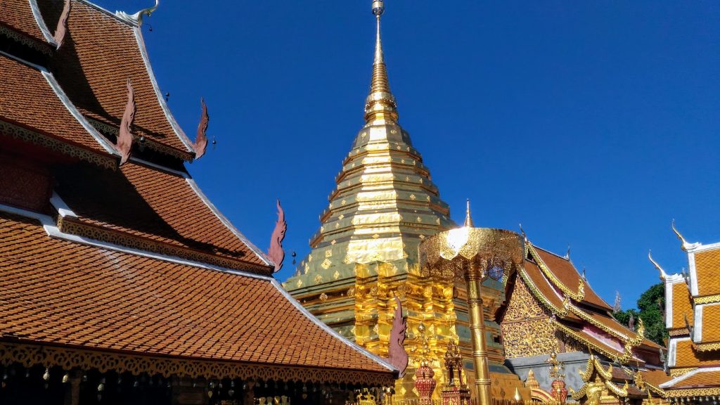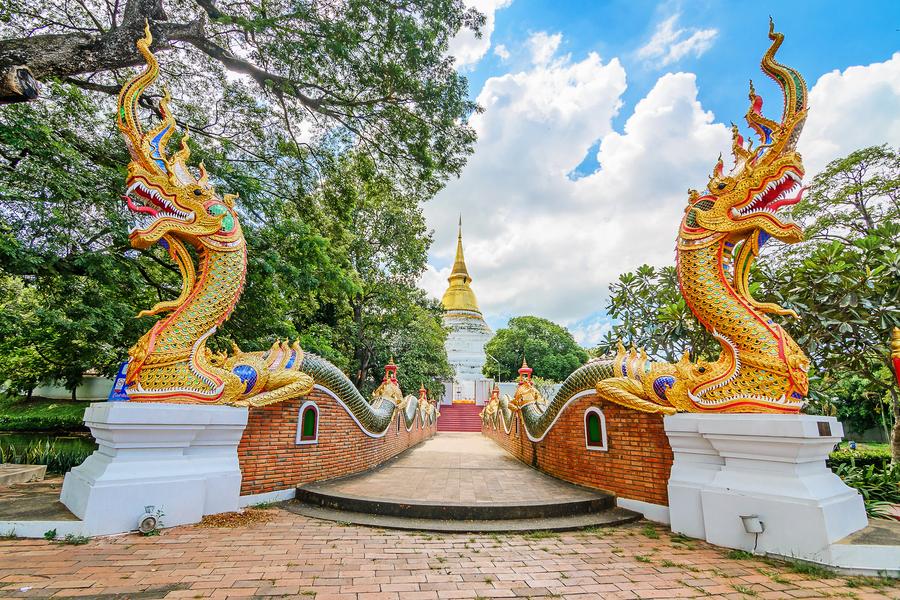 素贴山的「双龙寺」是清迈著名的佛教圣地,也是清迈的地标性寺庙,塔内供奉着佛陀的圣物和宝物,门前还有309级台阶,两侧被两条长龙雕塑守护,所以叫双龙寺。