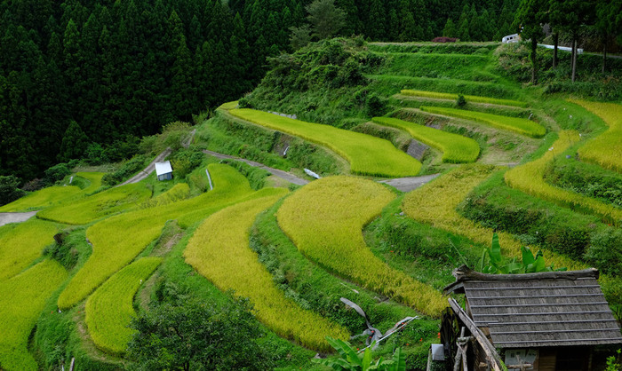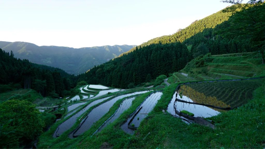 上胜町美在樫原梯田。而樫原梯田美在田埂的曲线,山脉的等高线映出了田埂的形状,使得一块块梯田犹如山涧之间的块块明镜,清新秀丽极了。除了樫原梯田,还有府殿梯田、大平·堂平梯田、市宇梯田、八重地梯田等美丽的梯田,成为了上胜町的乡间风景里最美的点缀。