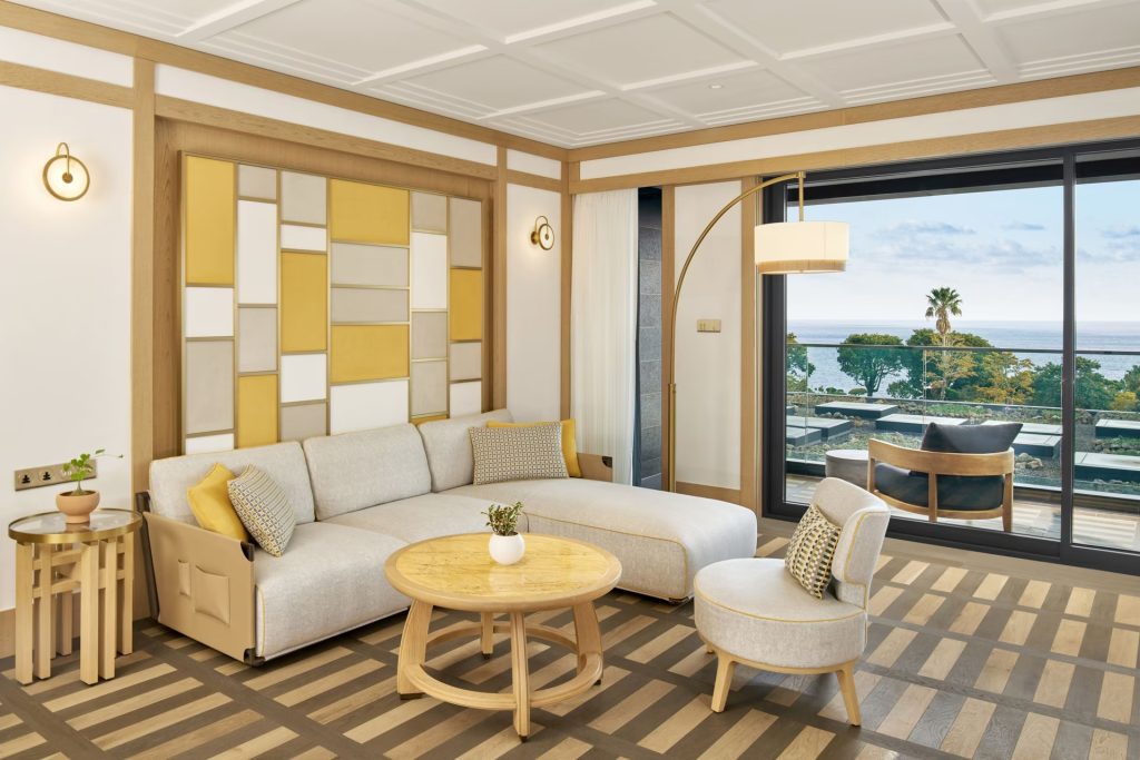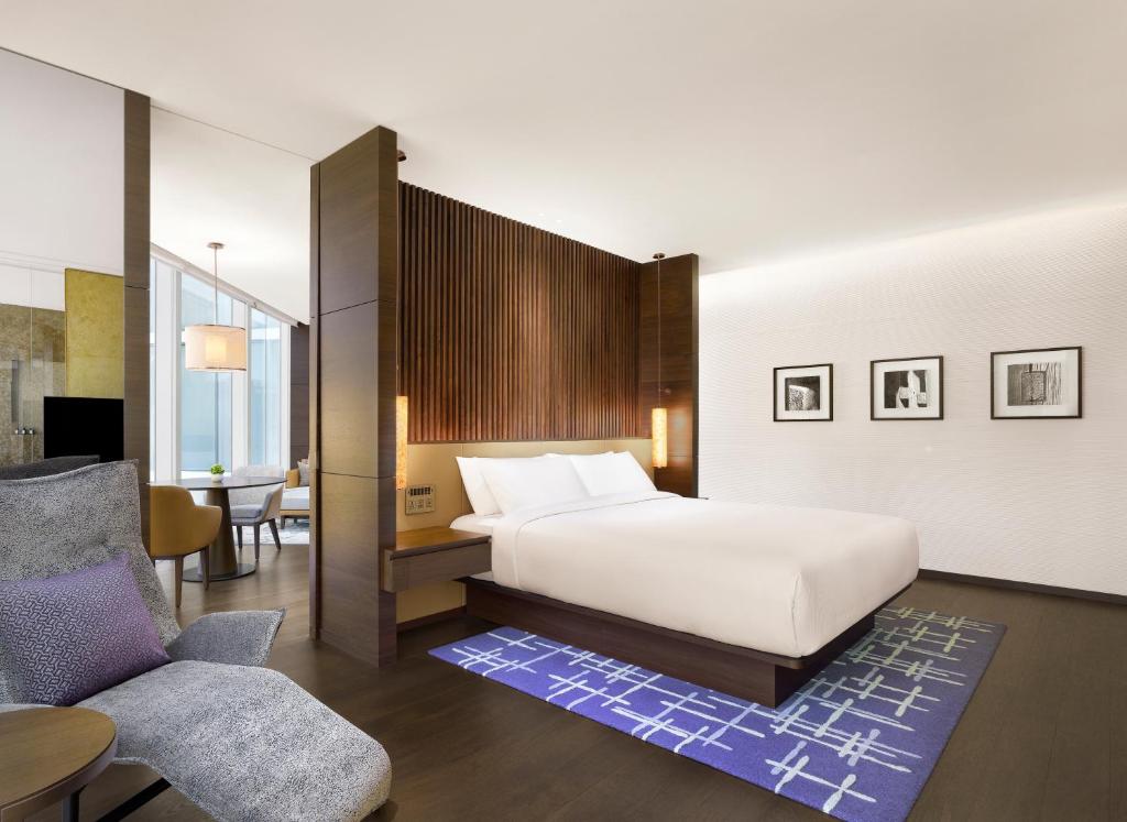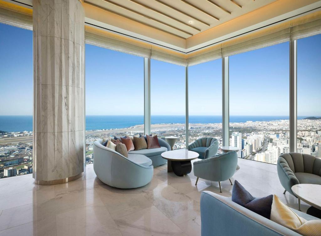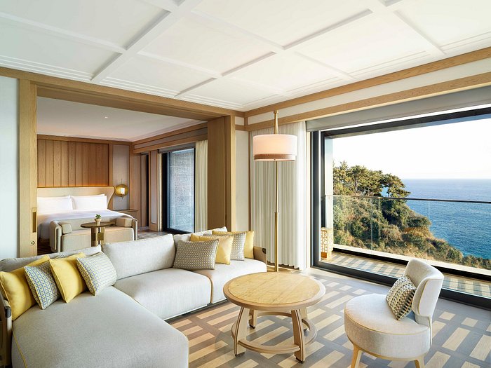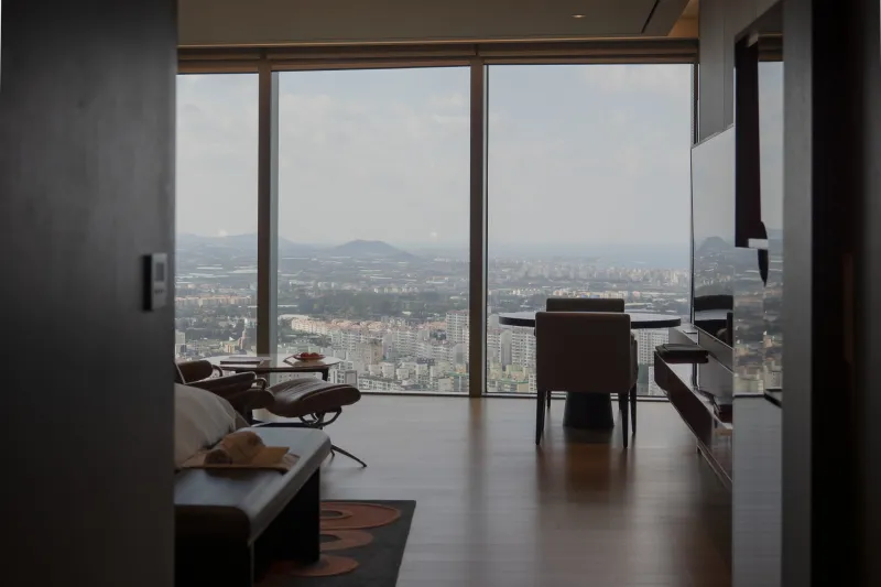 多元房型与景观优势:酒店是济州岛最高建筑,客房拥有济州岛的最佳景观。客房与套房均以“海景”为核心亮点,基础房型如豪华海景客房配备私人阳台,可俯瞰海岸线全景;君悦套房空间更宽敞,含独立起居区与定制卫浴设施,客房由韩国著名艺术家作品和现代家具装饰,营造出奢华精致的氛围。满足亲子或多人出行需求,细节处适配不同客群。