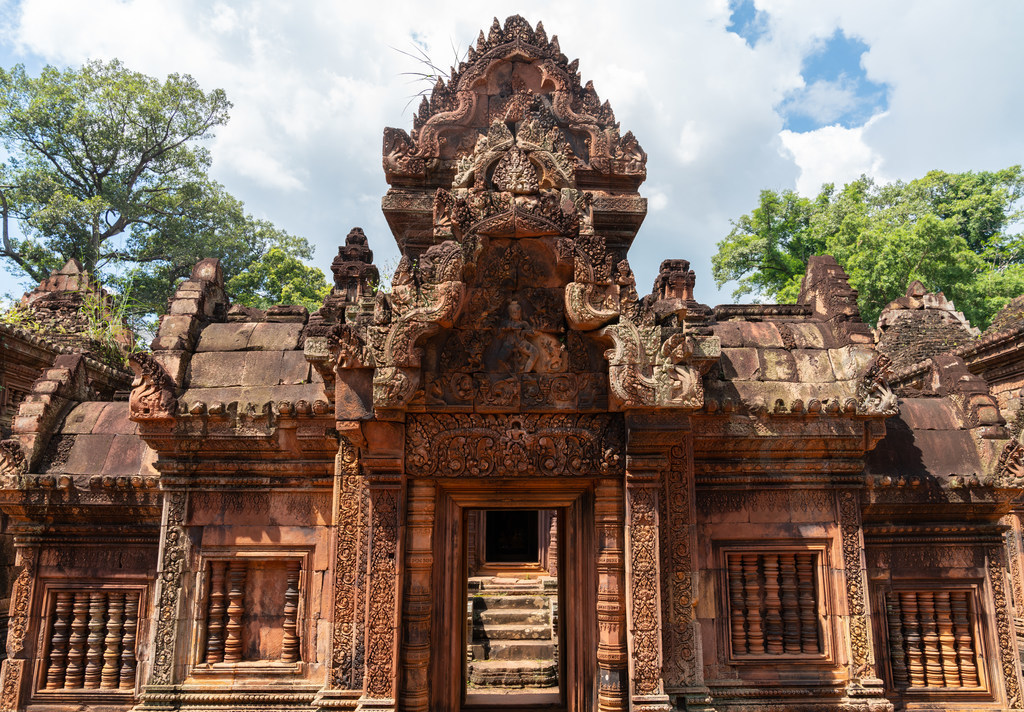 女王宫(Banteay Srei),位于柬埔寨暹粒省,距吴哥城约25公里,是柬埔寨三大圣庙之一,被誉为“吴哥古迹中的明珠”。这座寺庙供奉着婆罗门教三大天神之一的湿婆,由罗贞陀罗跋摩(Rajendravarman)时期开始建造,并于阇耶跋摩五世(Jayavarman V)时期完成。女王宫以其精美的雕刻和艳丽的色彩著称,其建筑主体区域面积大约为500平方米,寺院前的神道长约67米。