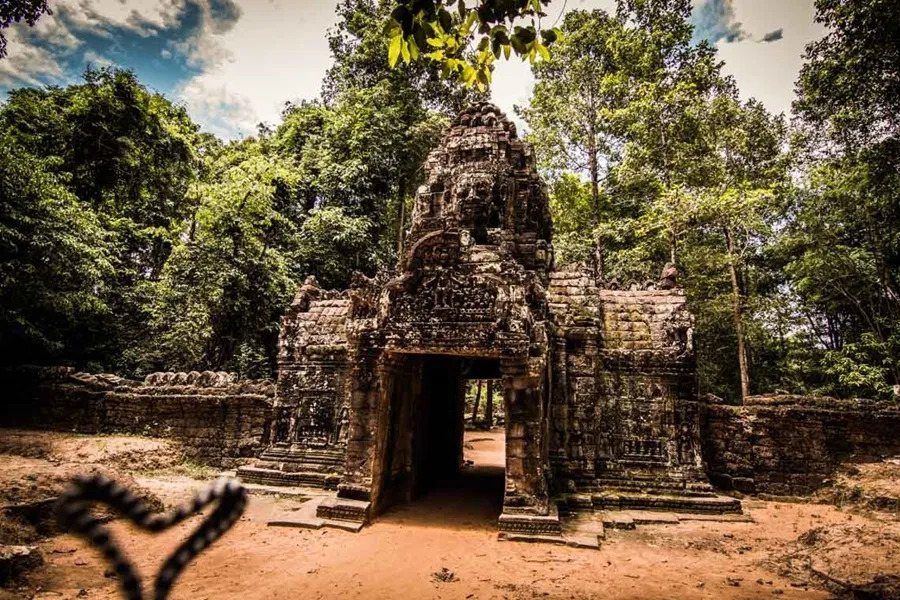 寺庙被巨大的树木根系所环绕,如蟒蛇般的树根爬满了寺庙并深入到建筑中,形成了一种独特的自然与人文景观。这种景象在世界上独一无二,使其成为了吴哥窟内最具神秘气息的景点之一。