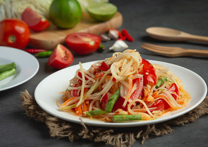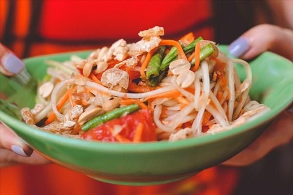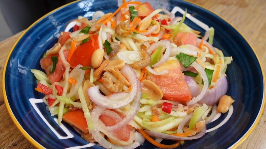 绿芒果沙拉是柬埔寨的一道清爽凉菜,选用青芒果、洋葱、辣椒、蒜等食材,搭配鱼露、柠檬汁等调料拌制而成。沙拉酸辣爽口,清新解腻,是夏日消暑的好选择。