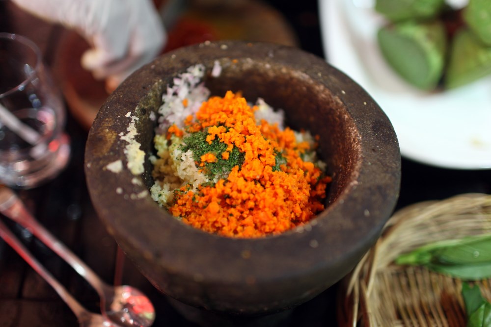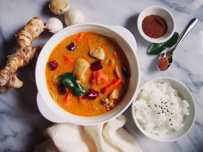 高棉红咖喱是柬埔寨的传统菜肴之一,选用鸡肉、鱼肉或蔬菜等食材,搭配红咖喱酱、椰浆和香料烹制而成。咖喱浓郁香辣,搭配米饭或面条食用,别具风味。