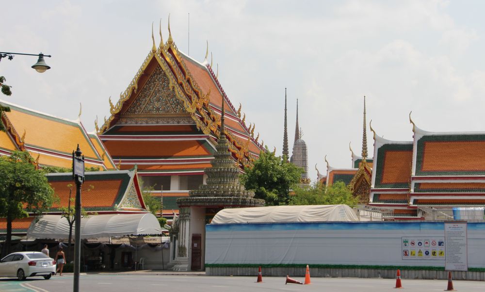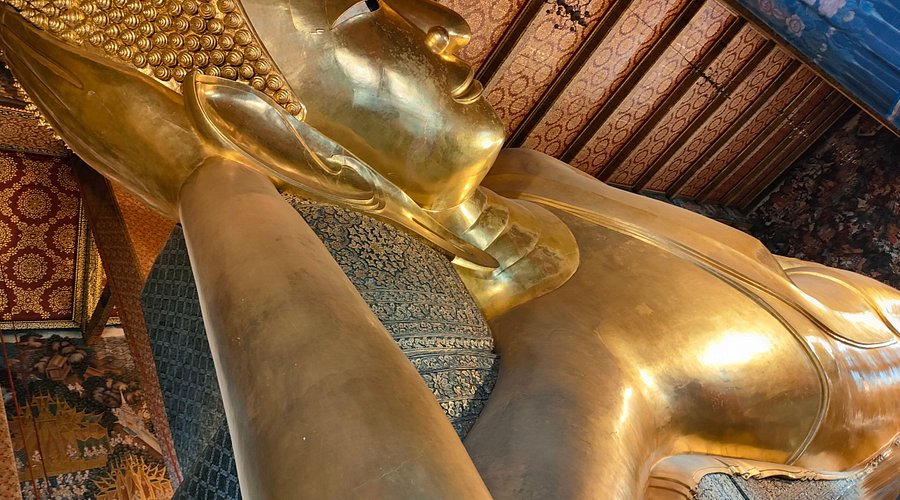 卧佛寺是泰国国内规模最大也最古老的佛寺,始建于1832年。寺中供着一座斜卧金身大佛,佛身长46公尺、高度为15公尺,鞋底则为真珠母所镶嵌,庄严壮丽。