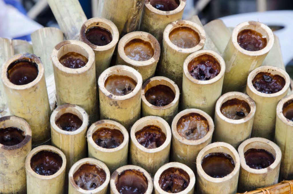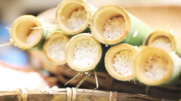 柬埔寨竹筒糯米饭,将糯米和其他配料,如椰浆、咖喱、猪肉和虾仁等,放进竹筒中,然后蒸煮而成。