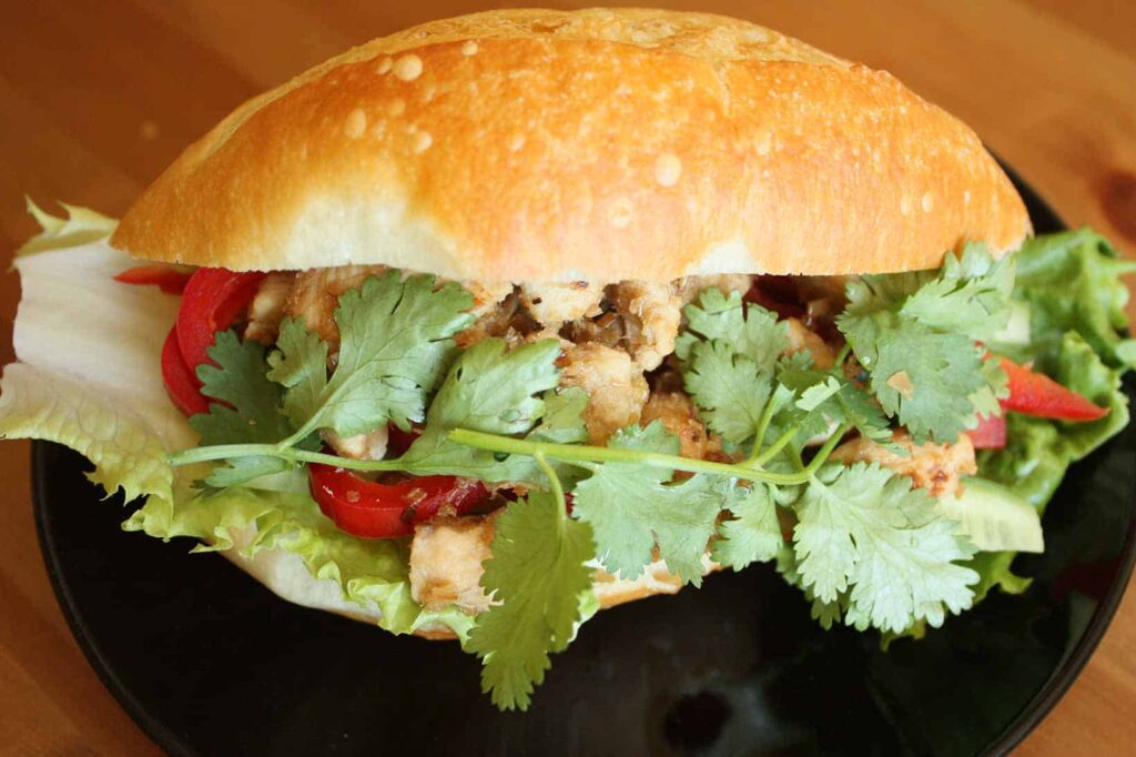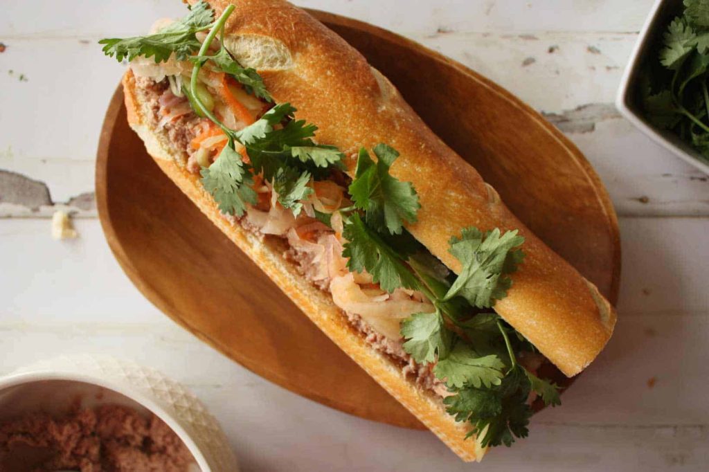 柬埔寨面包三明治,里面有烤猪肉、蔬菜和酱汁等。作为法国曾经的殖民地,柬埔寨在饮食上受到了法餐的影响。